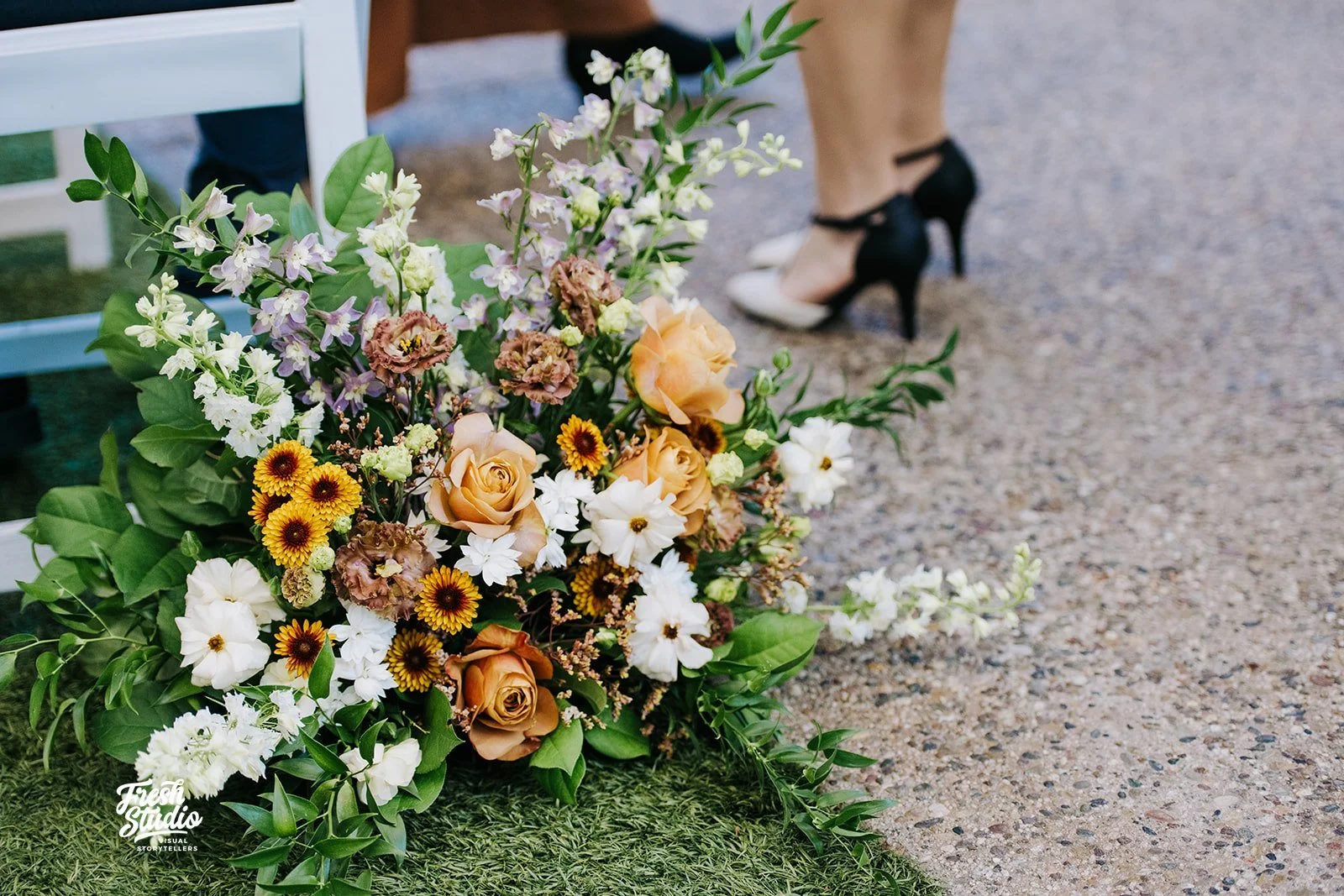 A large bouquet of mixed flowers, including roses, daisies, and other blooms, on a green grass surface next to a pebble path, with part of a person's legs and black high heels visible in the background.